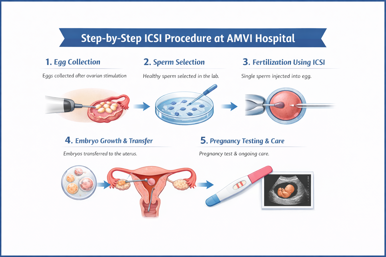 The success rate of ICSI depends on factors like age, egg quality, sperm health, and overall reproductive health. AMVI Hospital follows advanced techniques and personalized treatment plans to improve success outcomes.